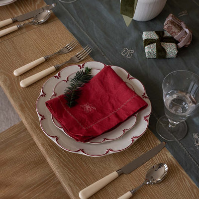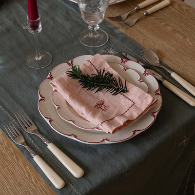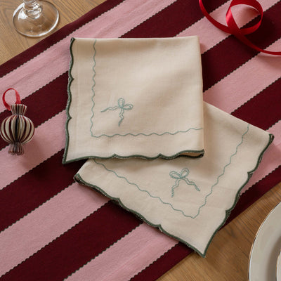 Complete your Christmas dining setup with our Christmas Napkins. Crafted from natural, eco-friendly fabrics, our napkins are made to be cherished and reused year after year. Choose from two festive styles: our Organic Cotton Napkins, featuring off-white fabric with a burgundy trim and embroidered bows, or our Linen Napkins, in a timeless natural tone with a hemstitched trim and scattered embroidery motifs. Both designs coordinate beautifully with our Table Runners, Tea Towels, and Oven Gloves, making it easy to create the perfect Christmas tablescape.