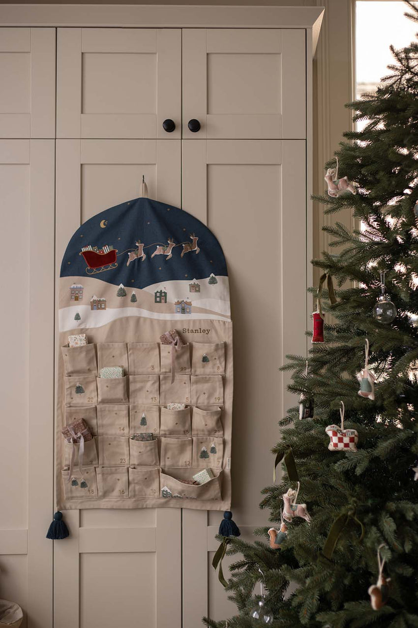 This fabric advent calendar pairs beautifully with our Christmas Stockings, Present Sacks, and Tree Decorations. Each year we tweak our Christmas designs with new themes so you know you are truly receiving a unique piece from a limited run. This advent calendar style is not available for personalisation, please view our two other Advent Calendar designs for personalisation options.