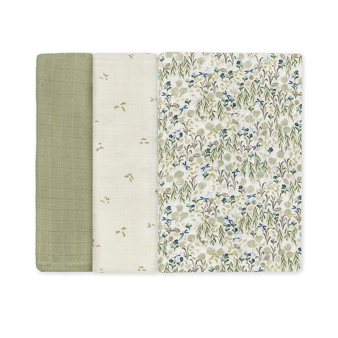 - Set of 3 Muslin Squares – Super soft organic cotton muslins, perfect for spills, burping, swaddling, or doubling up as a light blanket. A true multi-use essential for any new parent.
