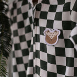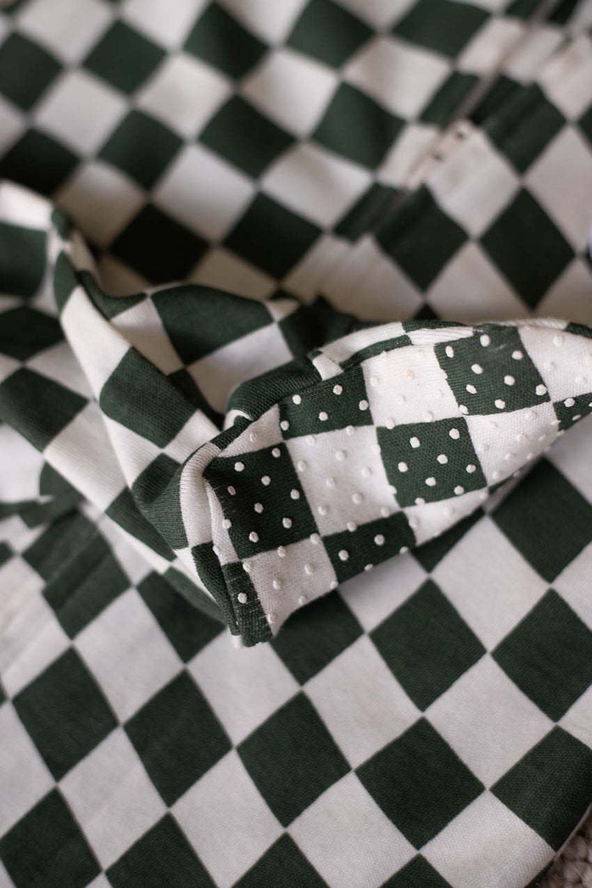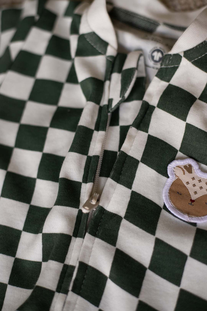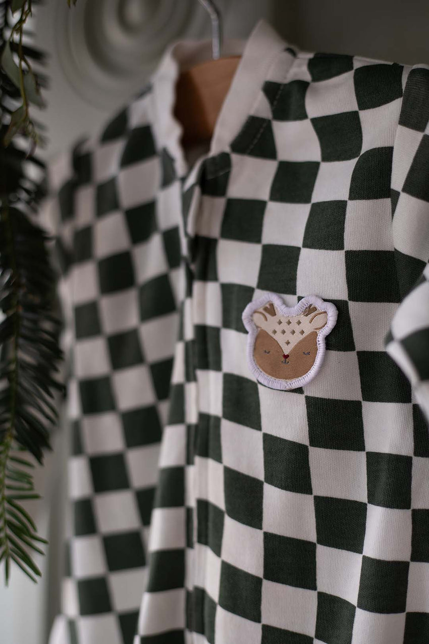 Snuggle your little one in our cosy Green Checkerboard Christmas Sleepsuit, crafted from the softest 100% organic cotton jersey. Featuring a festive green checkerboard pattern complemented by an embroidered sweet and sparkly Reindeer patch on the chest.