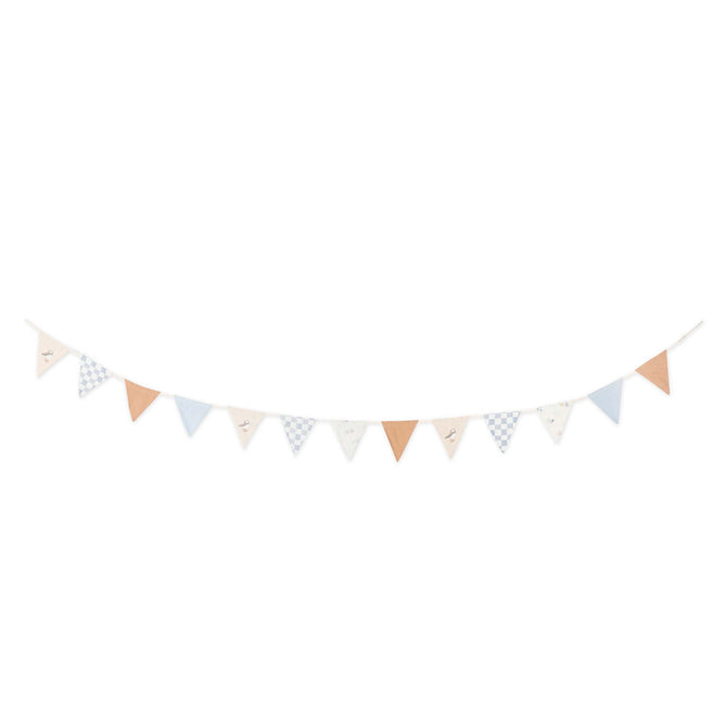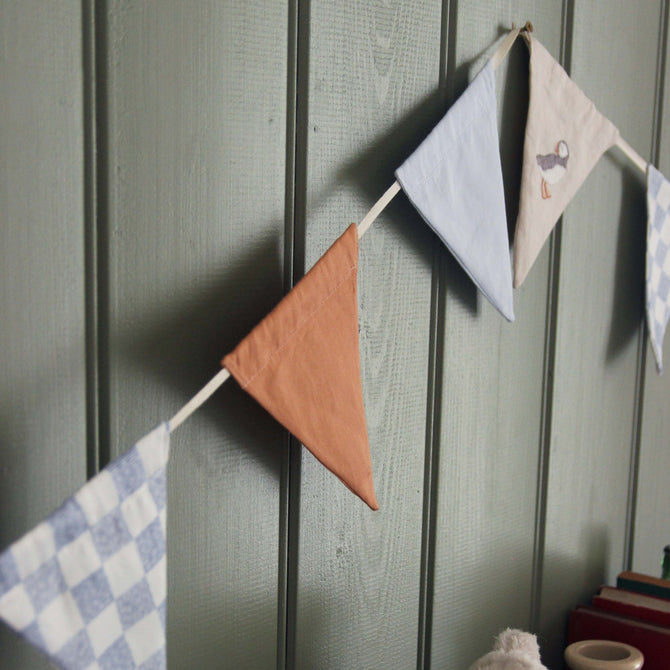 Add a playful touch to any room with our organic cotton flag bunting. This decorative bunting consists of 13 flags and is over 3 meters long, making it a versatile decorative touch perfect for adorning playroom or nursery walls. Featuring our Coastline and Waves prints, alongside lovely tones of orange and blue and our beautifully embroidered coastal puffin.