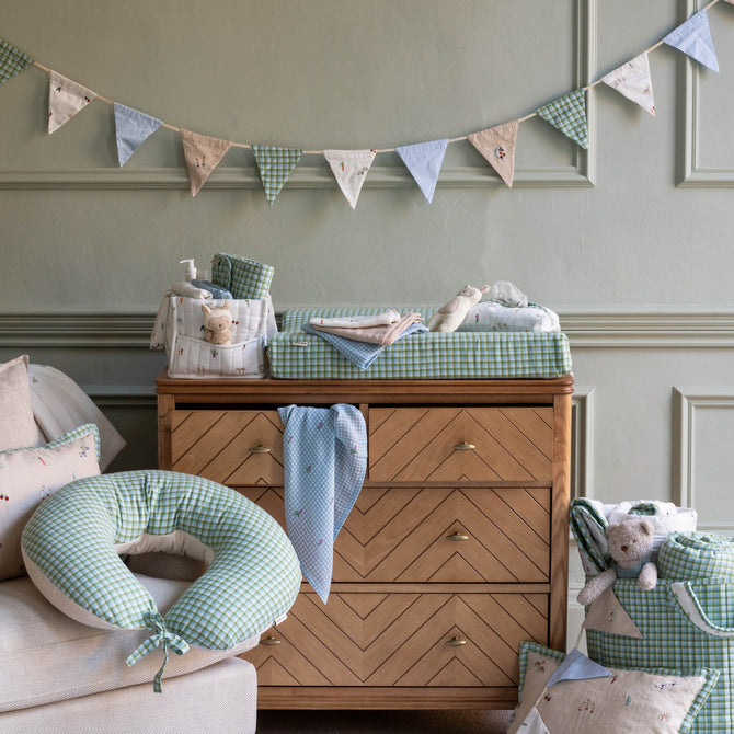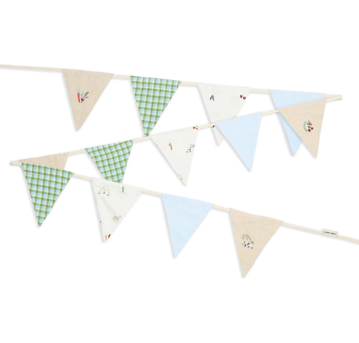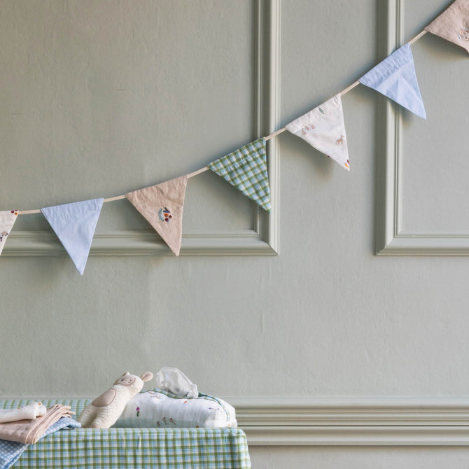 Add a charming and playful touch to your little one’s nursery or playroom with our Little Farm Organic Cotton Bunting. Featuring 13 flags and over 3 meters long, this decorative bunting is perfect for brightening walls, shelves, or windows, while coordinating beautifully with the rest of the Little Farm collection. Adorable embroidered ducks, printed Little Farm friends and woven Greenhouse Gingham fabric create the beautiful bunting flags.