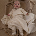 Carefully wrapped in tissue and placed in an elegant gift box, each blanket, bonnet and booties set comes with a care guide and a story of their creation, making the perfect gift to treasure for years to come.