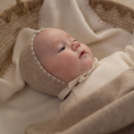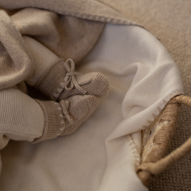 Wrap your newborn in luxury with our 100% cashmere blanket, bonnet and booties set, featuring a soft oatmeal base with a natural tone trim and presented in a beautiful gift box. Our adorable baby bonnet and booties both feature a secure tie to keep your little one’s head and toes snug and covered, fitting newborns up to 3 months, and our sweet blanket is designed to swaddle, wrap and cover with softness and ease. A perfect keepsake, this cashmere set is designed to become a cherished part of your little one’s first months.
