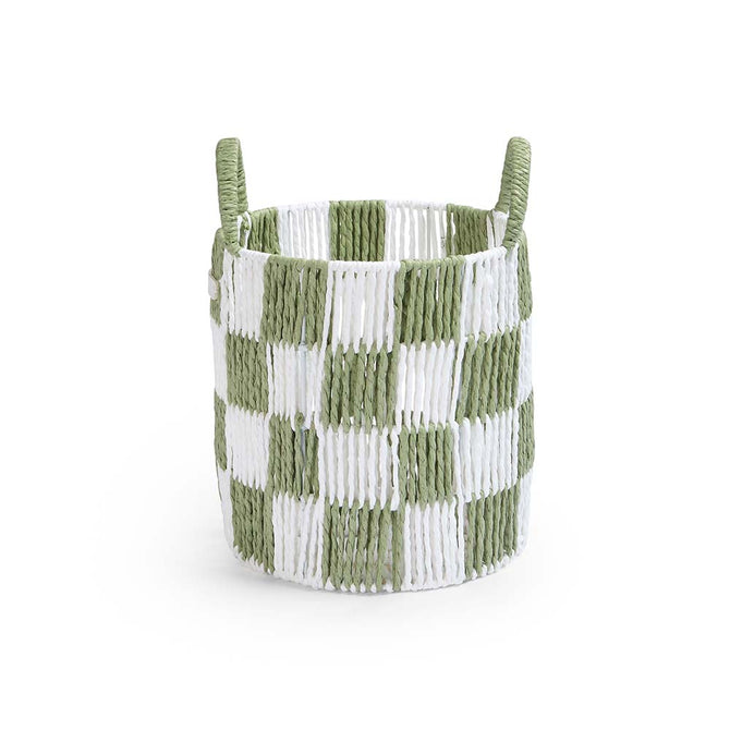 Add a touch of fun and practical storage to your little one’s room with our Checkerboard Baskets. The contemporary sage check design brings a playful pop of colour to any space. Made with paper wrapped around a sturdy wire frame, these baskets are both beautiful and durable. In the nursery, this small size is perfect for storing nappies, creams, and muslins. As your child grows, it’s ideal for organizing toys, shoes, or even serving as a mini laundry basket.