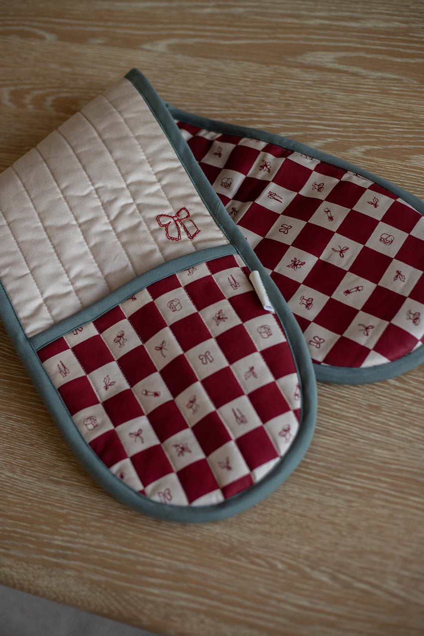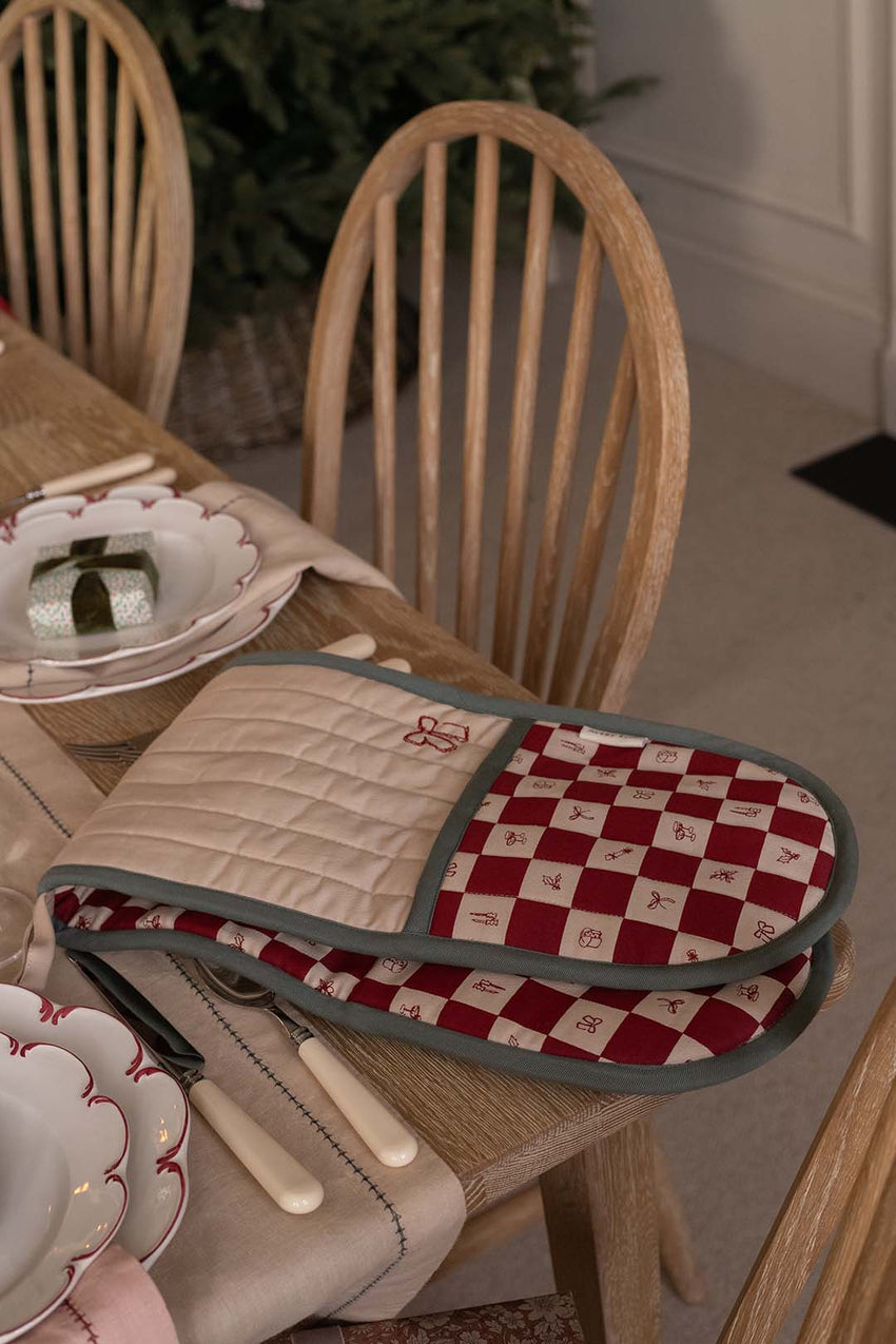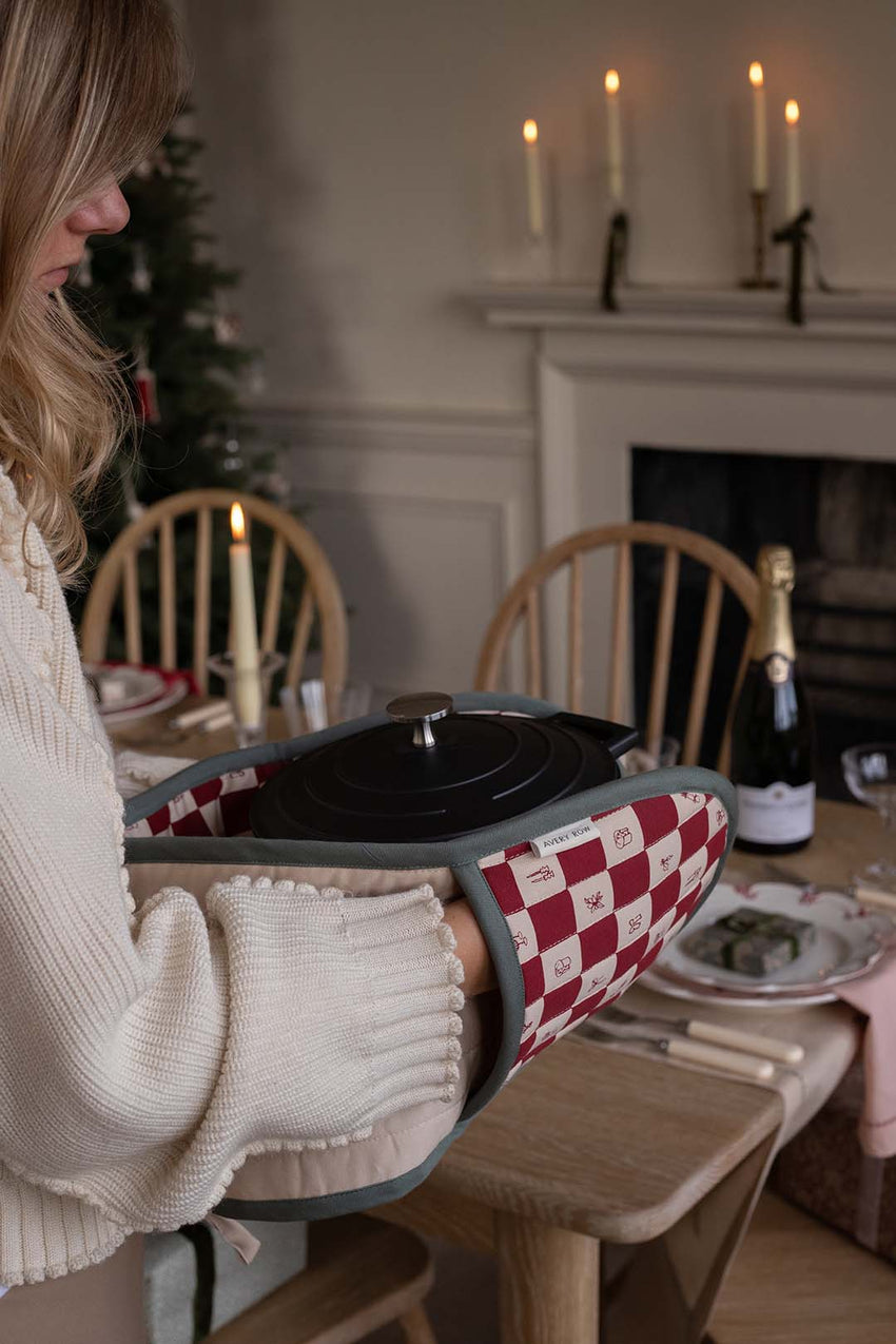 Serve your festive meals in style with our organic cotton Christmas Oven Gloves. Designed with a playful checkerboard design, contrasting dark green binding, and a delicate embroidered bow, these double oven gloves are both practical and beautiful. Quilted with a thermal lining to keep hands safe and comfortable, and finished with a handy hanging loop, they’re perfect for everyday use throughout the holiday season.