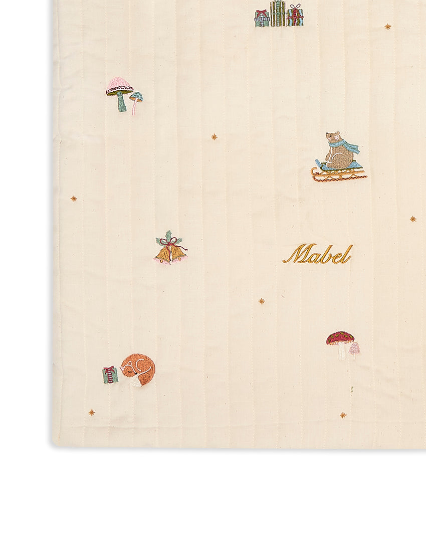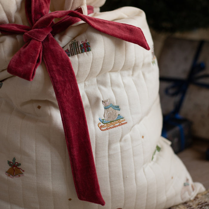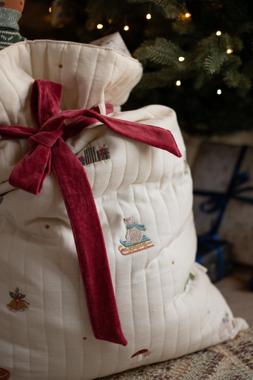 Make Christmas morning extra magical with our Christmas Present Sack – a timeless way to keep special gifts under the tree. Perfect for keeping presents tucked away until the big reveal, these reusable Christmas sacks are a festive tradition little ones will look forward to year after year. Crafted from lightly quilted organic cotton with embroidered details, each sack is finished with a luxurious velvet tie to keep treasures safe. Personalise your Present Sack with your little one’s name or family surname using our embroidery service.