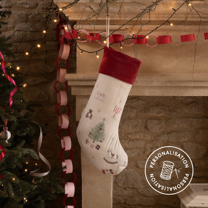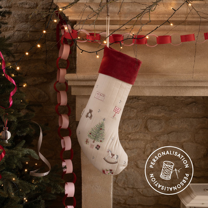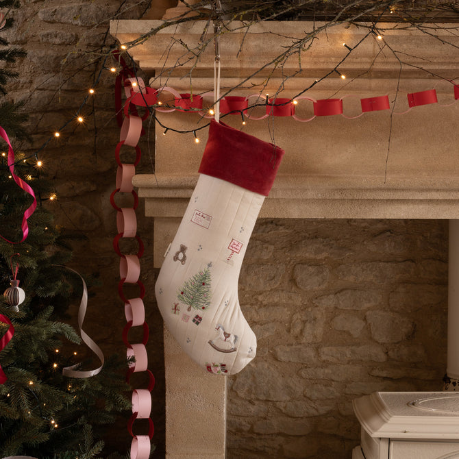 Part of our Letters To Santa Collection, follow the magical journey of a special letter as it travels to the North Pole, then from Santa’s workshop to gifts in his sleigh, ready to be unwrapped by little ones on Christmas morning. Adorned with sparkly embroidered stars, this stocking is an investment piece little one's will treasure for years to come. Each year we tweak our Christmas designs with new themes so you know you are truly receiving a unique piece from a limited run. Our Christmas stockings pair beautifully with our matching Advent Calendars, Present Sacks, and Tree Decorations.