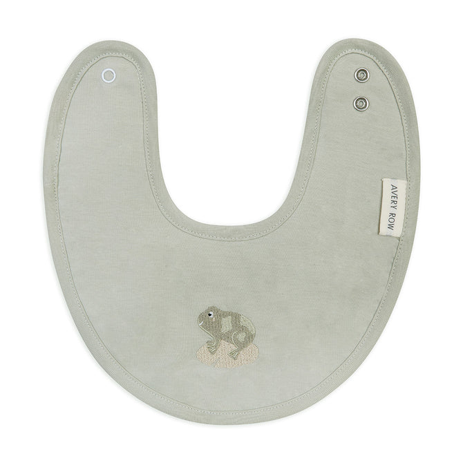 This soft organic cotton bib is perfect for milk feeds and teething babies. Made from soft cotton jersey with a terry cotton back for extra absorption, this bib features a sweet little embroidered frog and is designed as part of our Riverbank collection.