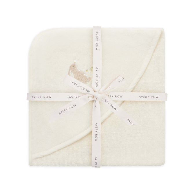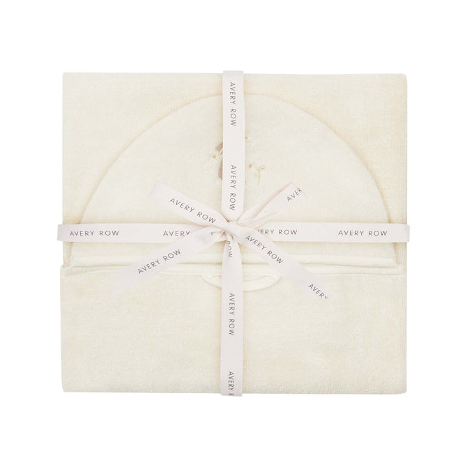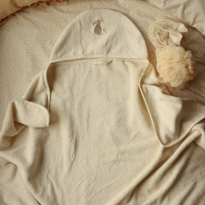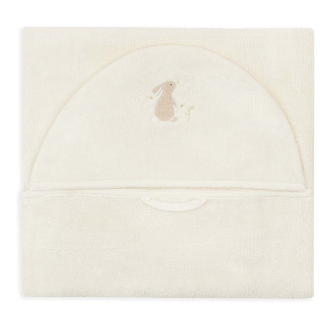This organic cotton terry towelling hooded towel is beautifully soft for the most delicate skin. Designed as part of our Chamomile collection, the towel features an embroidered little bunny on the front. Perfect for bath times with your little one.