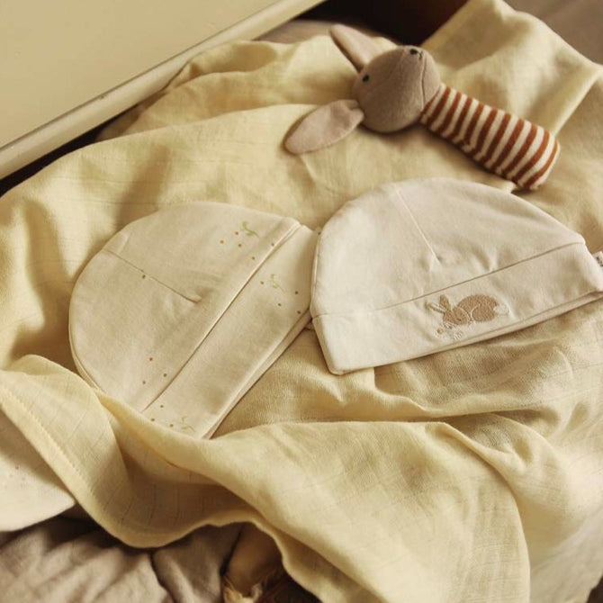 Keep your little one cosy with our embroidered jersey hat, featuring a sweet sleeping bunny as part of the Chamomile collection. Made from the softest 100% organic cotton jersey to be gentle on your babies skin. Our hats are a classic shape with a folded over hem for secure wear. A stylish accessory in your babies wardrobe, and makes the perfect gift.