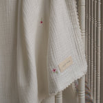 This organic cotton muslin blanket is a versatile and charming addition to your baby’s nursery, perfect for gifting or everyday use.