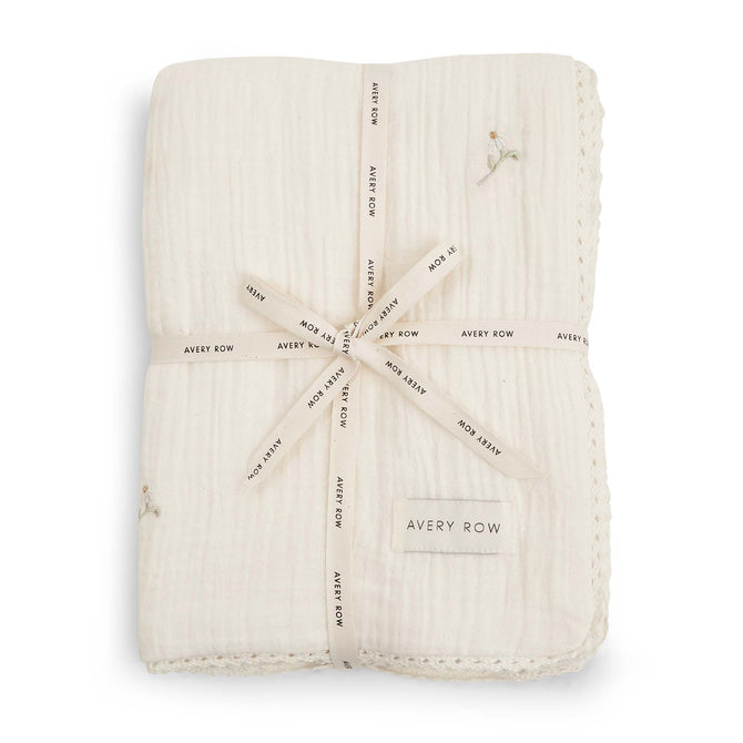 This beautiful organic cotton four-layer muslin blanket is embroidered on one side with a pretty chamomile flower and finished with a delicate lace trim. Lightweight and breathable, this snuggly blanket is perfect for your little one, and makes a thoughtful gift.