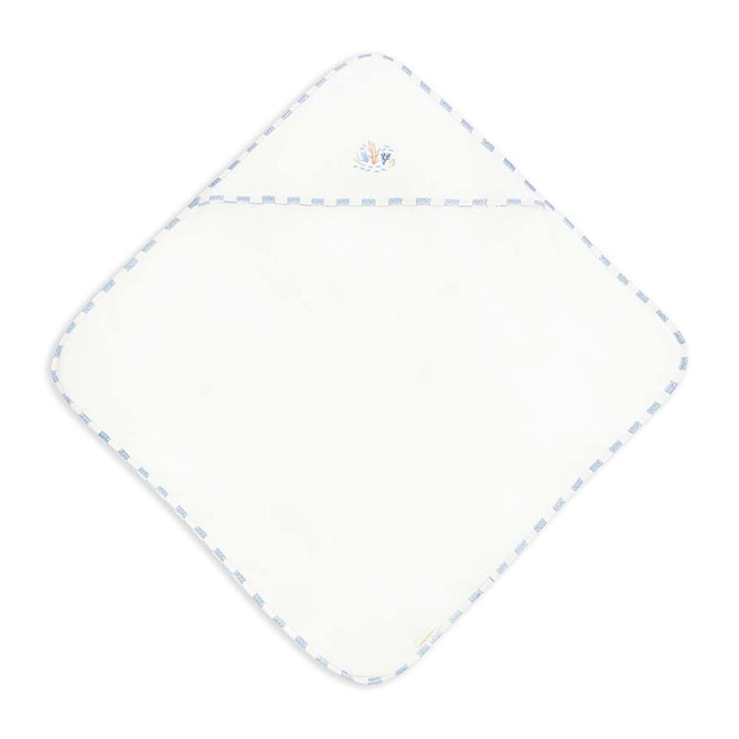 This organic cotton terry towelling hooded towel is beautifully soft for the most delicate skin. Designed as part of our Coastline collection, the front is embroidered with shoals of fish swishing through seaweed. Perfect for bath times with your little one.