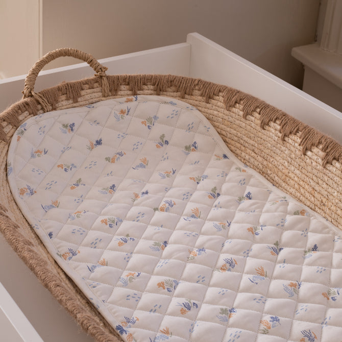Our Maize Baby Changing basket is Crafted from natural maize with a jute trim, it adds a stylish touch to both the nursery and your home. We have paired this with our Coastline organic cotton liner which offers a soft, comfortable surface for your little one during changing time. The organic cotton percale has a light water resistant coating to delay liquids being absorbed into the soft cotton fabric.