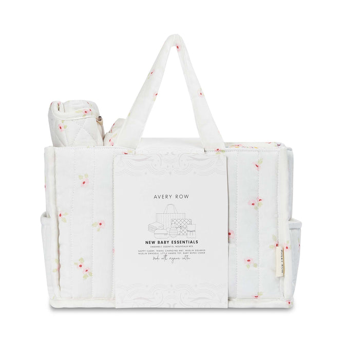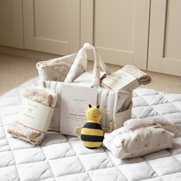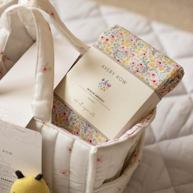 Celebrate a new arrival with our New Baby Essentials Gift Set, a thoughtfully curated bundle of organic cotton baby must-haves. Beautifully presented in our quilted Nappy Caddy, this set includes everything parents need for those first precious months - combining practicality, sustainability, and timeless Avery Row style. All made with organic cotton and organic dyes and in our unique Wildflower Garden collection print design and woven Pink Check fabric. Set includes: