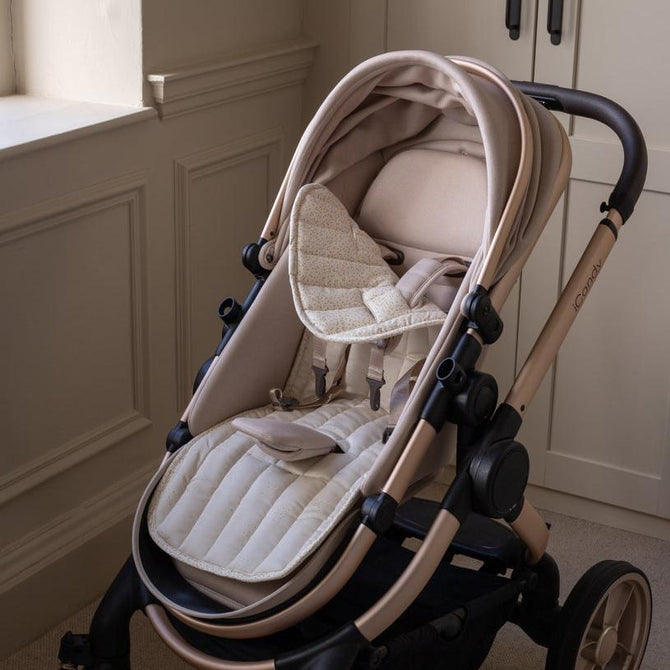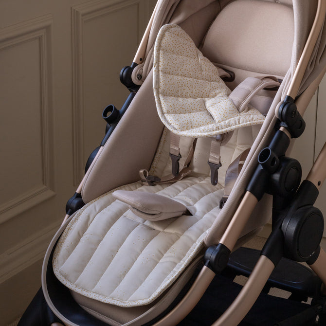 Our Pram liners are perfect for catching crumbs and creating a comfy, cosy, stylish pram. Designed to be a universal fit for all prams, our liners feature multiple slots to ensure a perfect fit for any model. These reversible pram liners are made from organic cotton sateen and organic dyes with a recycled polyester filling.