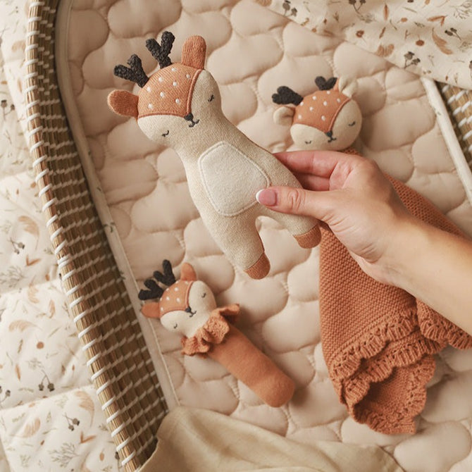 Meet your little one's first friend. This sweet Dainty Deer rattle has been designed for little hands to grip, shake and squish. The rattle inside gives this a playful, interactive element and the little neck ruff adds sensory texture and cuteness.
