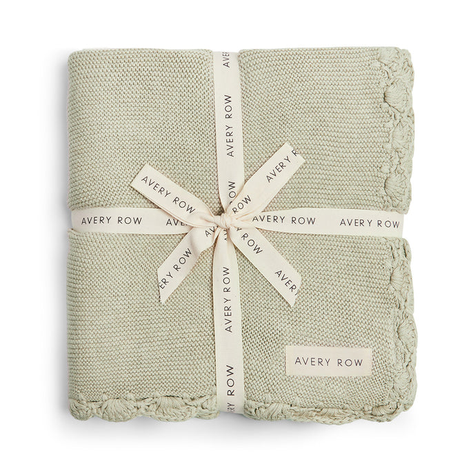 Introducing our new scalloped edge 100% organic cot ton blanket. The unique scallop design adds something a little extra to this classic style. Available in three nature inspired colours. All wrapped up in our branded ribbon to make the perfect new baby gift. Use to keep the little one warm in their crib or pram.